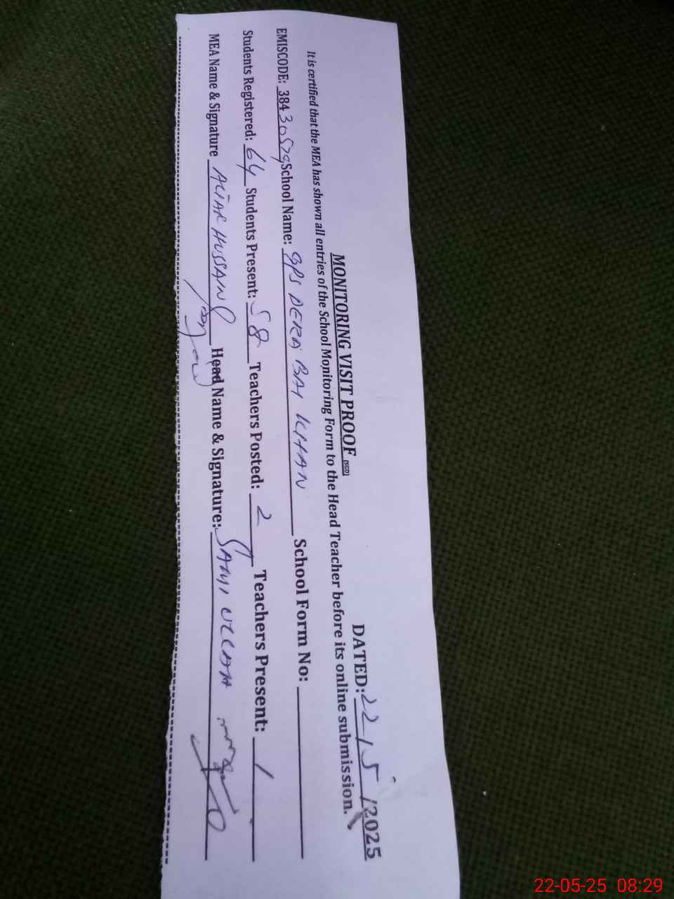 | Certified that this School was Inspected by the Undersigned MEA/DMO Today and the Information Stated Above is as Per Record. | |||||