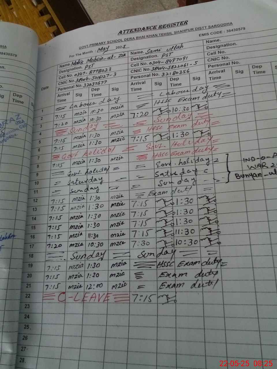 | CNIC | Full Name | Designation | R/C | Absence during last cal. month |