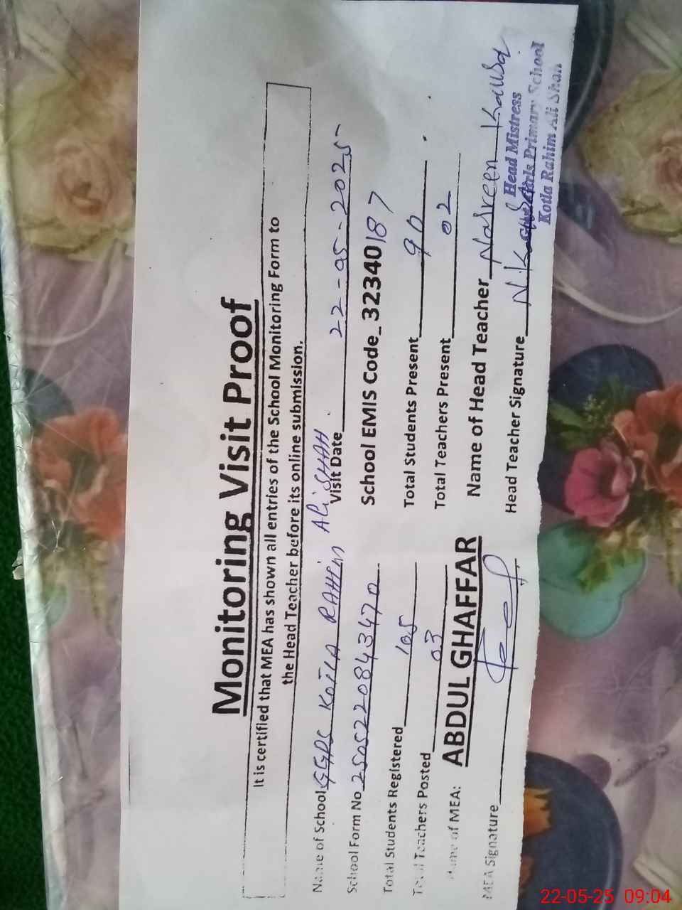 | Attendance Register | Head Teacher | MEA with School | Visit Proof |