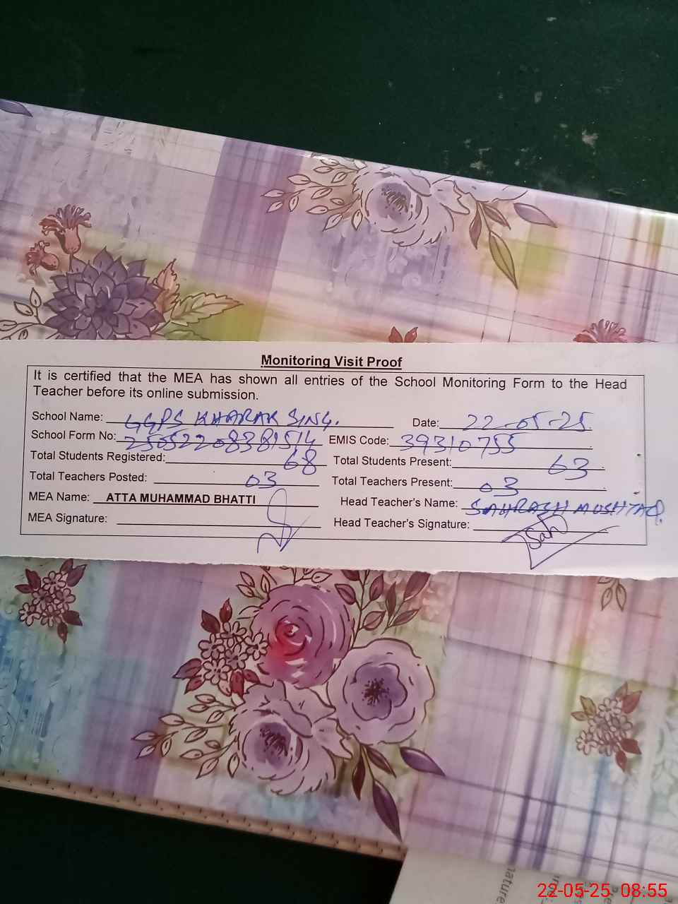 | Attendance Register | Head Teacher | MEA with School | Visit Proof |