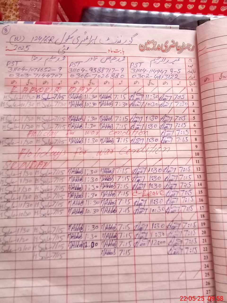 | CNIC | Full Name | Designation | R/C | Absence During Last Calender Month |