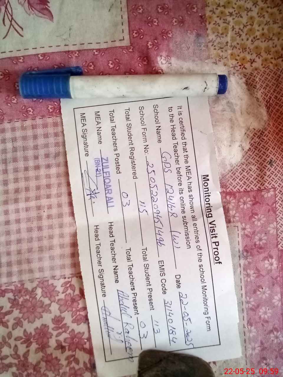 | Attendance Register | Head Teacher | MEA with School | Visit Proof |