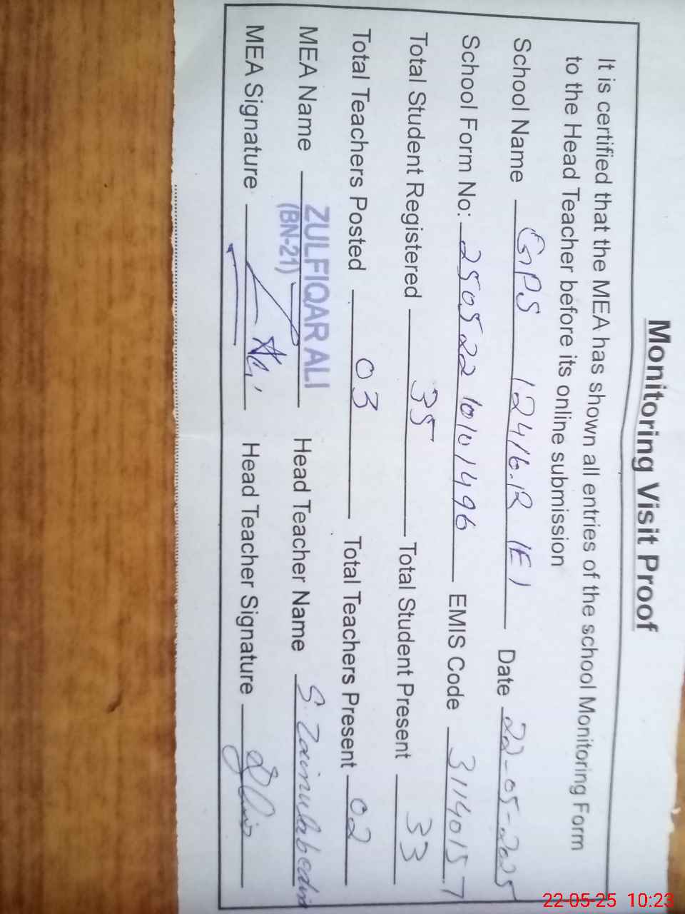 | Attendance Register | Head Teacher | MEA with School | Visit Proof |