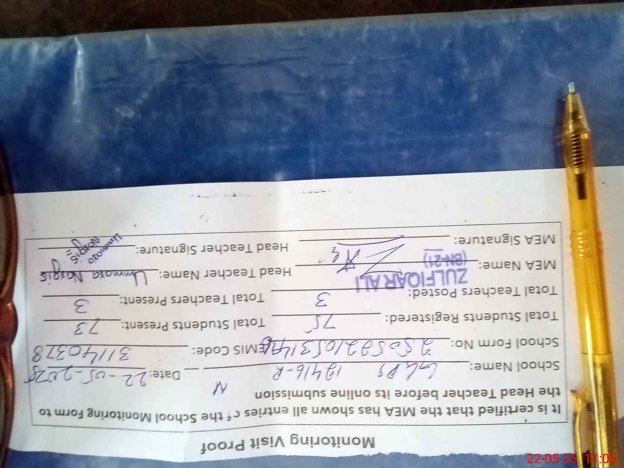 | Attendance Register | Head Teacher | MEA with School | Visit Proof |