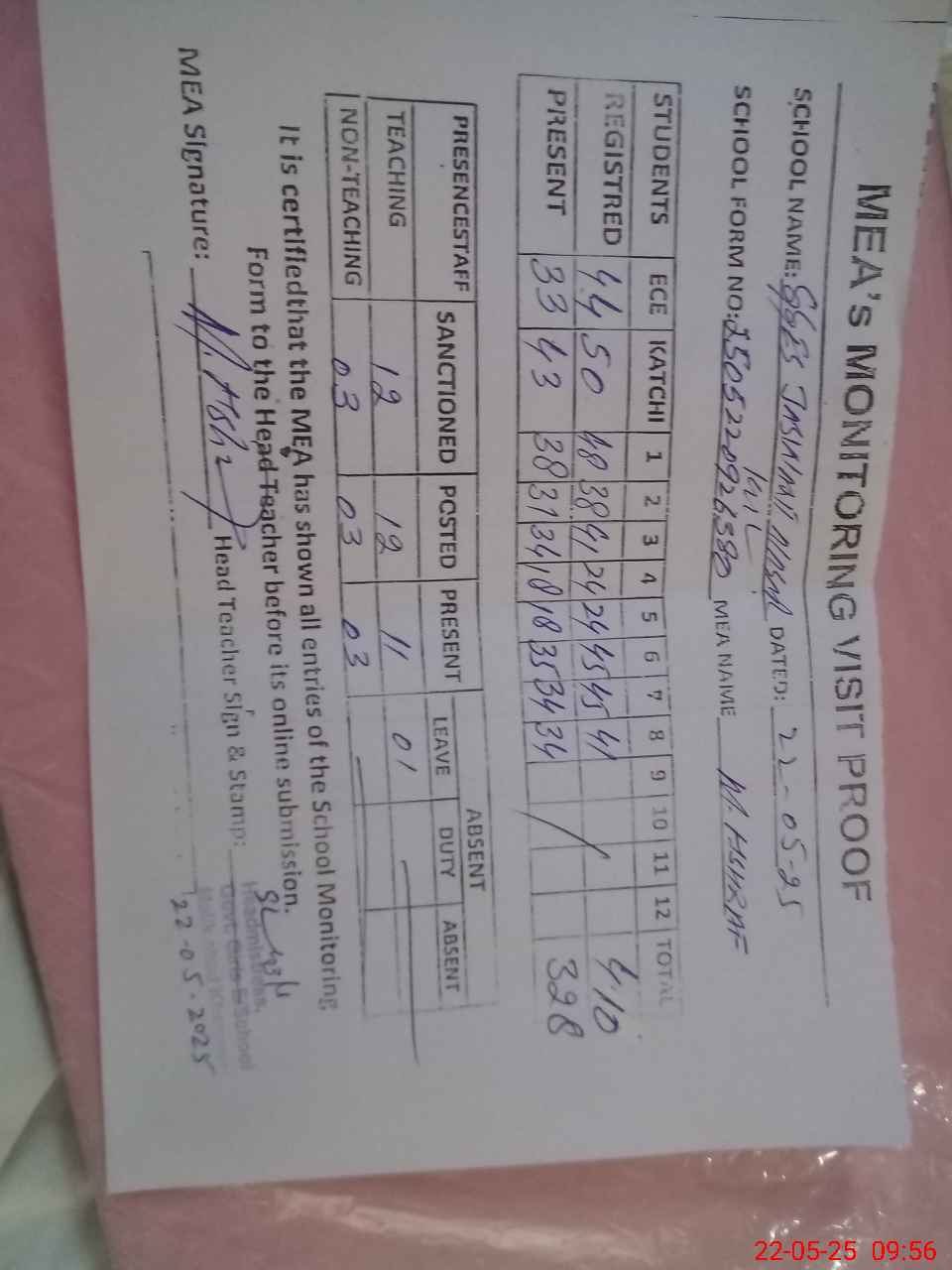 | Attendance Register | Head Teacher | MEA with School | Visit Proof |