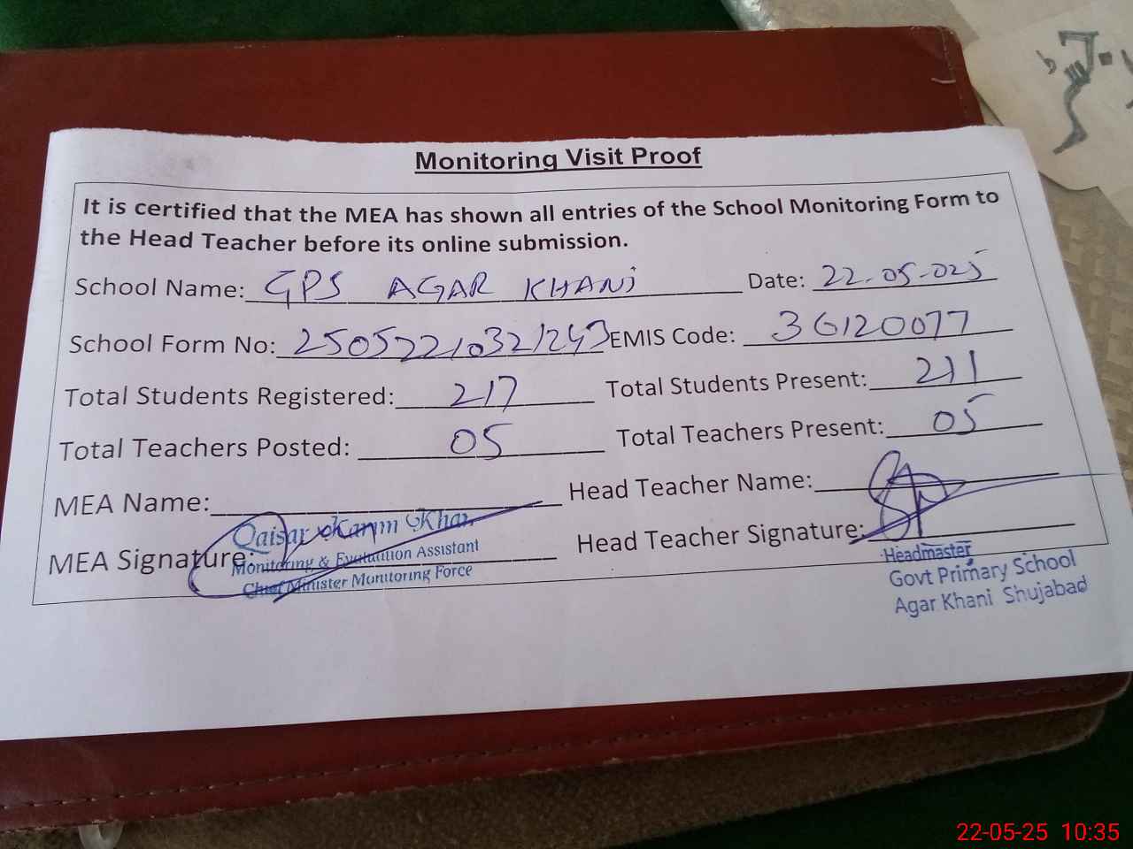 | Attendance Register | Head Teacher | MEA with School | Visit Proof |