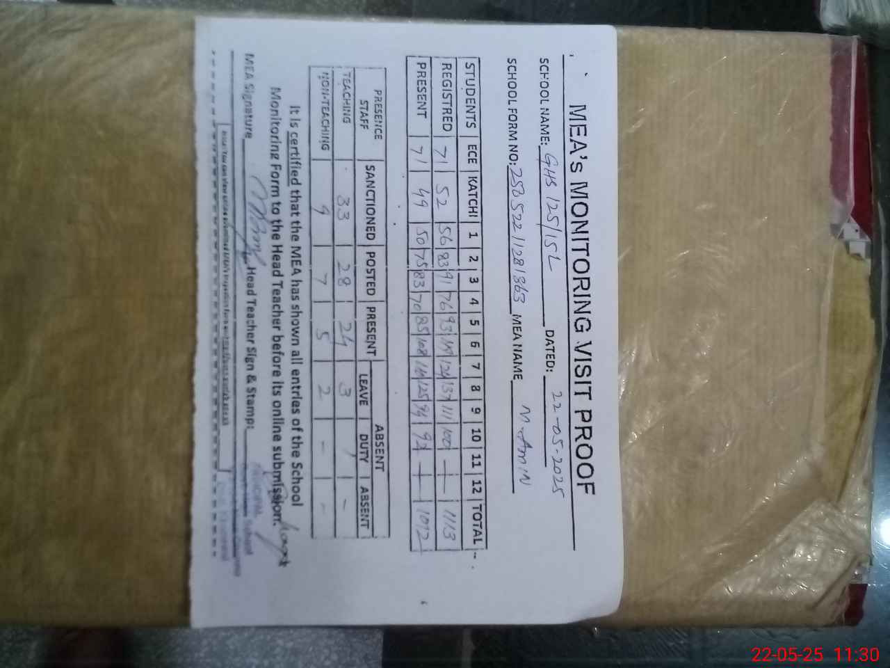 | Attendance Register | Head Teacher | MEA with School | Visit Proof |