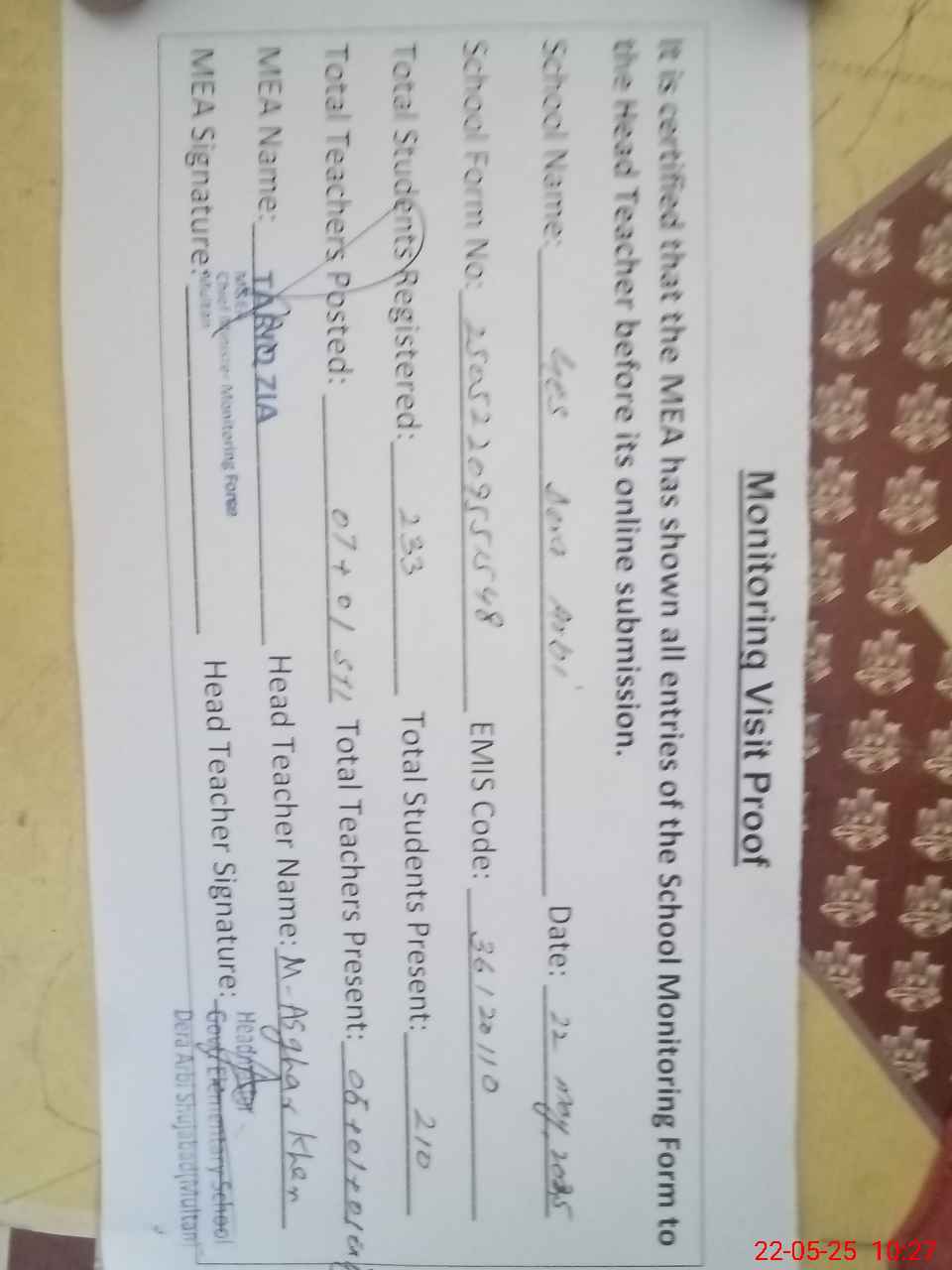 | Attendance Register | Head Teacher | MEA with School | Visit Proof |
