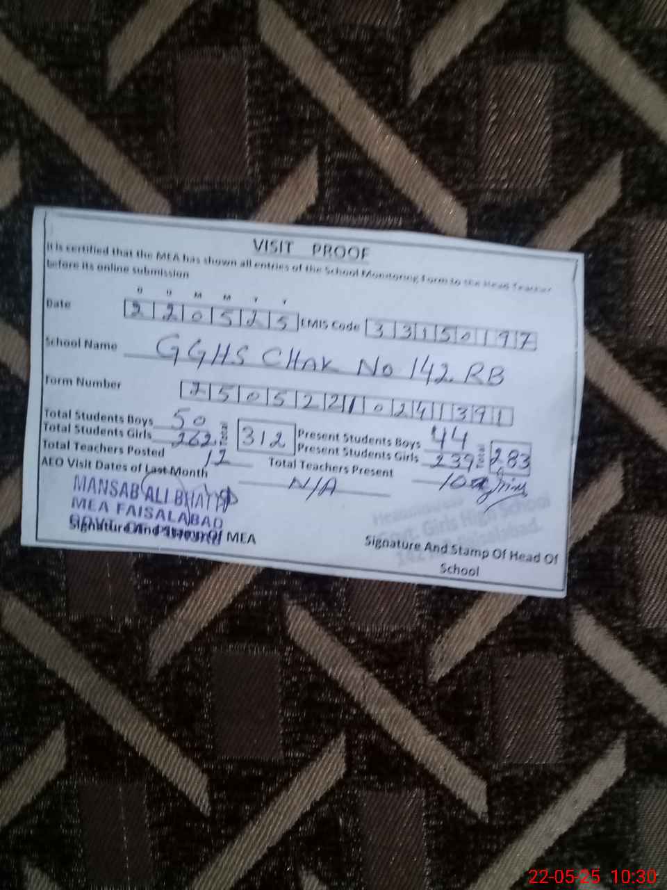 | Certified that this School was Inspected by the Undersigned MEA/DMO Today and the Information Stated Above is as Per Record. | |||||