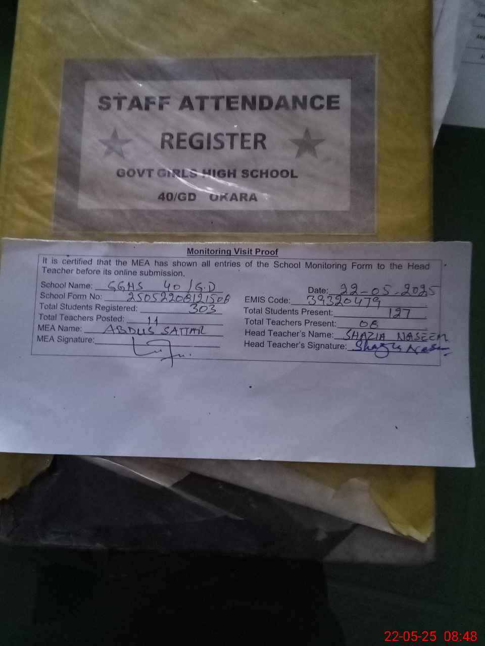 | Attendance Register | Head Teacher | MEA with School | Visit Proof |