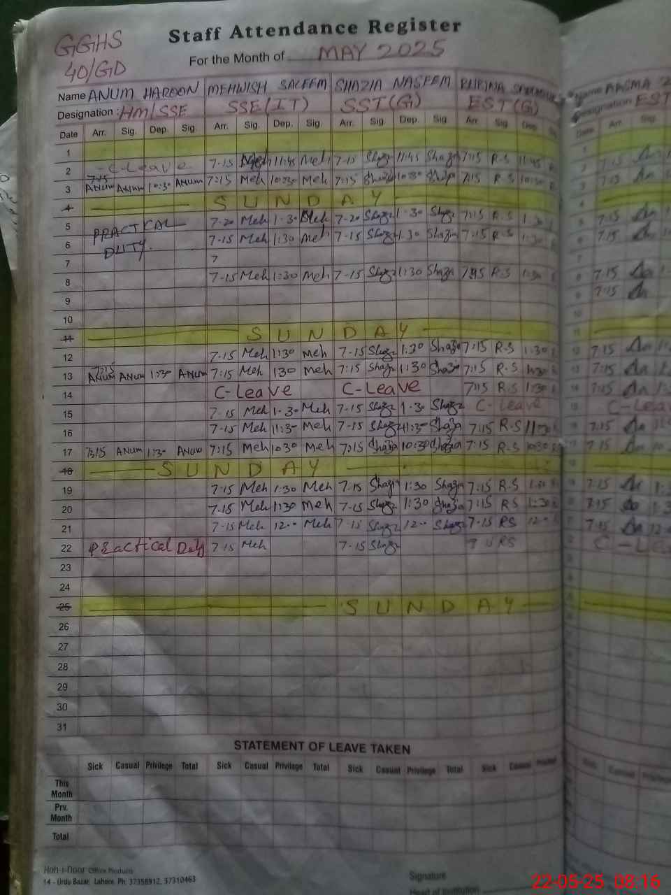 | 35**** | Qa**** Sh**** | Regular | 1 | 21 | 0 | 0 | 0 | 0 | 0 | 0 | 1 | Exam Duty | |