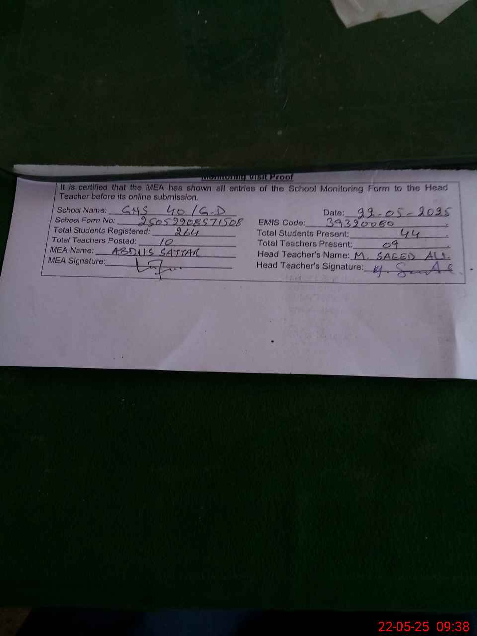 | Certified that this School was Inspected by the Undersigned MEA/DMO Today and the Information Stated Above is as Per Record. | |||||