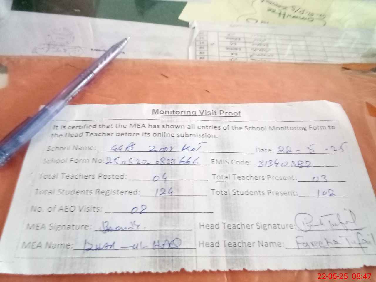 | Attendance Register | Head Teacher | MEA with School | Visit Proof |