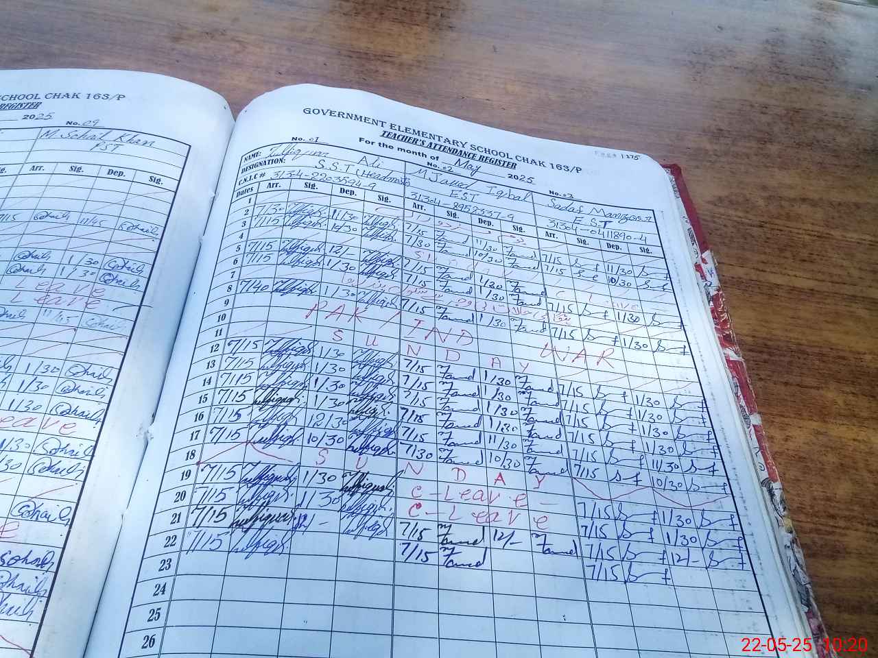 | CNIC | Full Name | Designation | R/C | Absence during last cal. month |