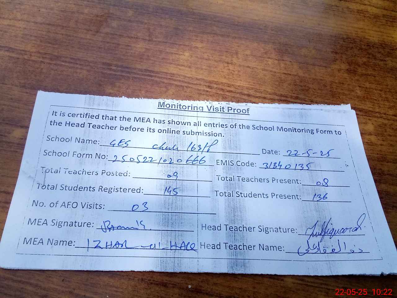 | Monitoring Date: 22-05-2025 | Start Time: 22-05-2025 10:01 AM | End Time: 22-05-2025 10:23 AM | Name of MEA: Mu**** Iz**** UlHa**** | |
