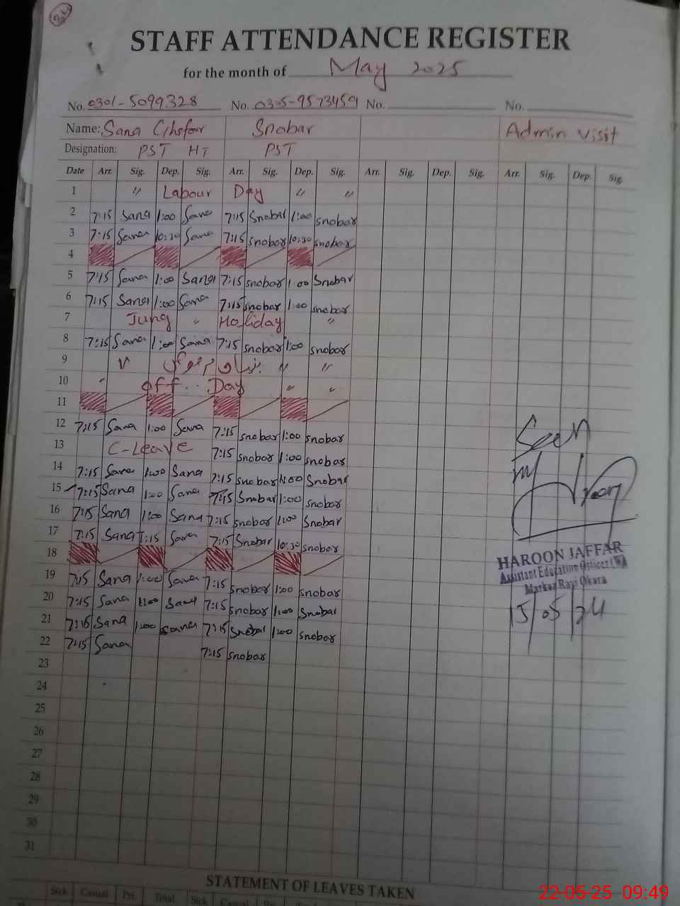 | CNIC | Full Name | Designation | R/C | Absence during last cal. month |