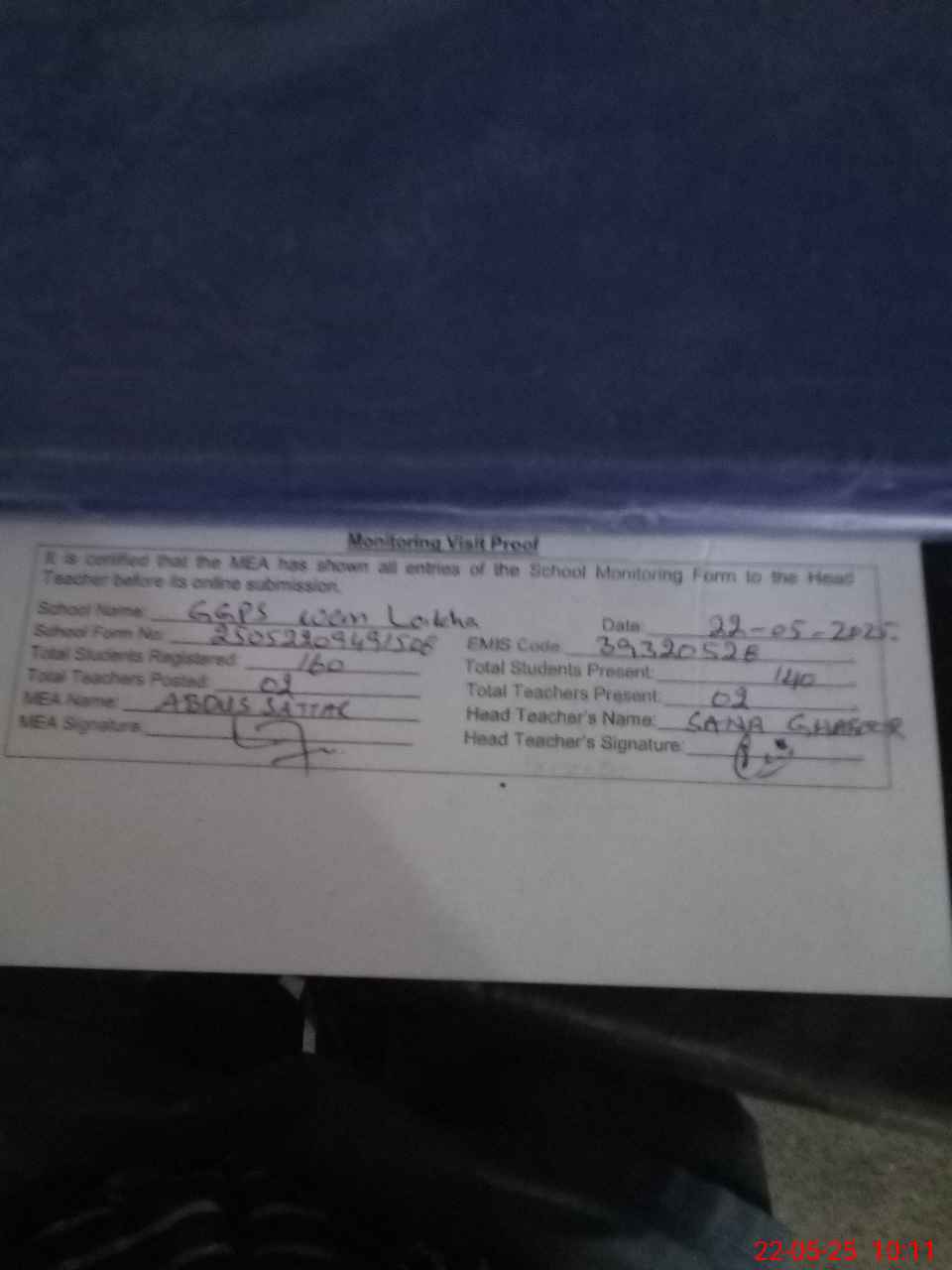 | Attendance Register | Head Teacher | MEA with School | Visit Proof |