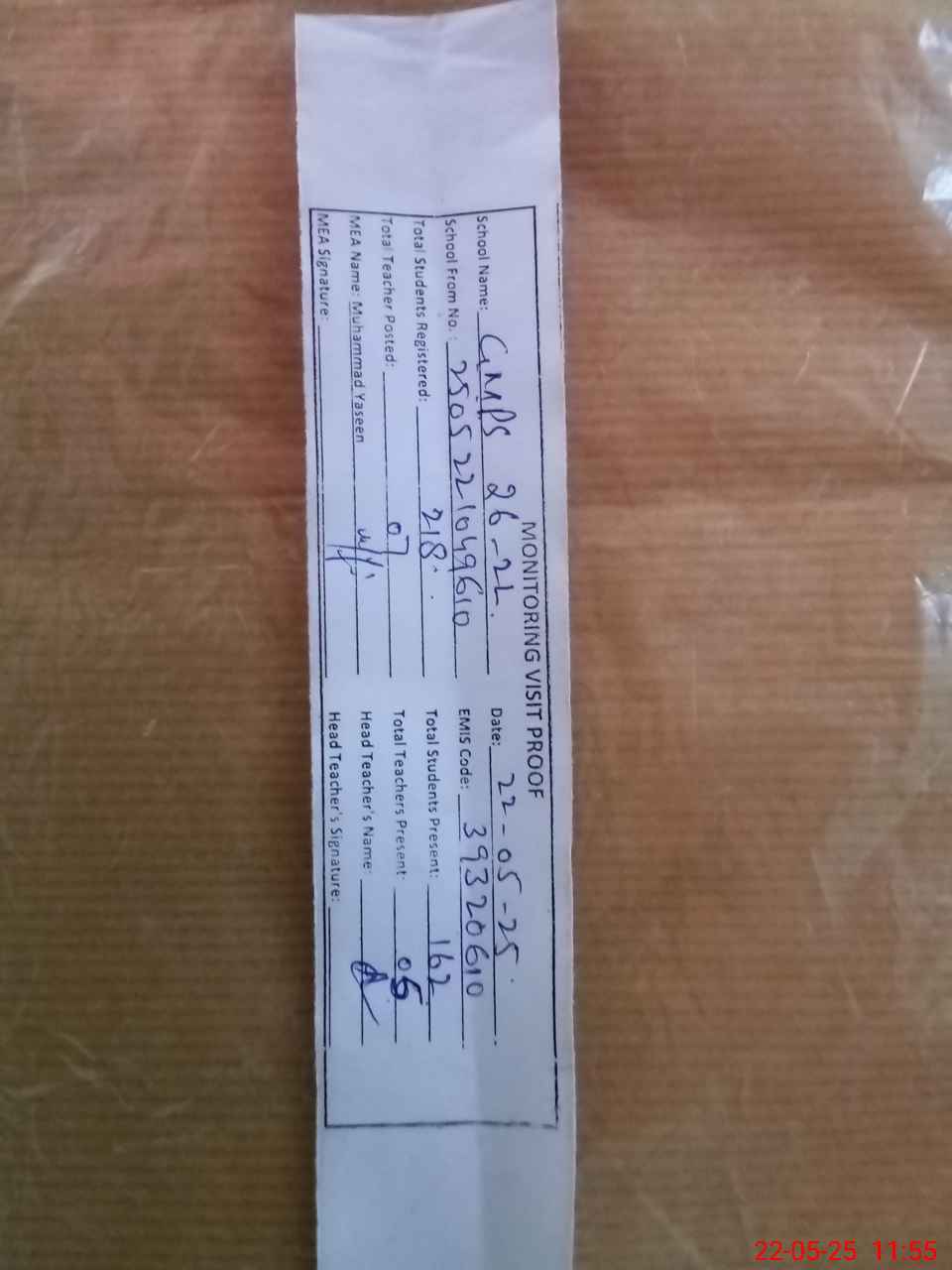| Attendance Register | Head Teacher | MEA with School | Visit Proof |
