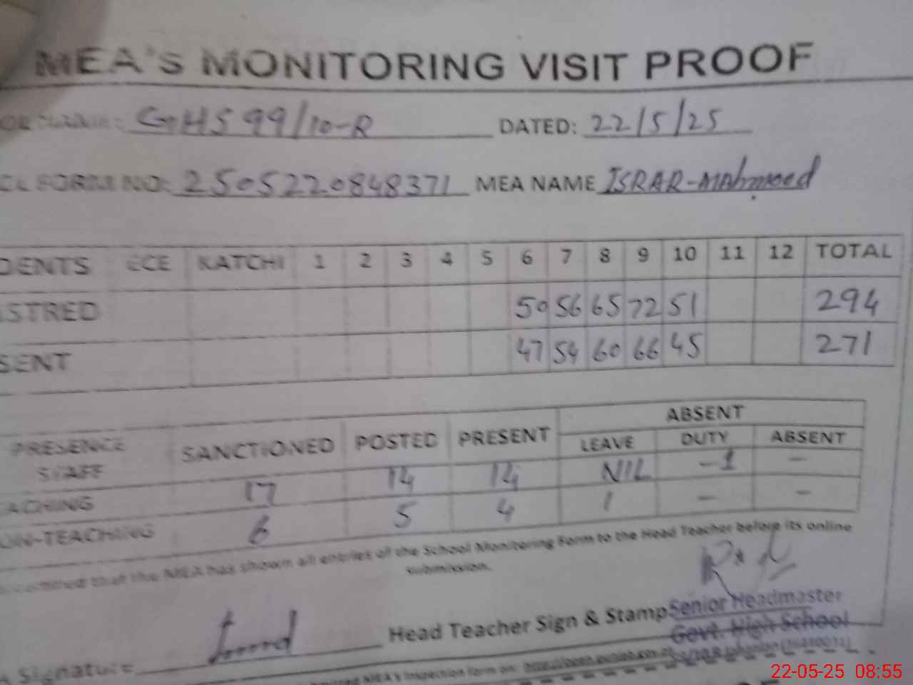 | Attendance Register | Head Teacher | MEA with School | Visit Proof |