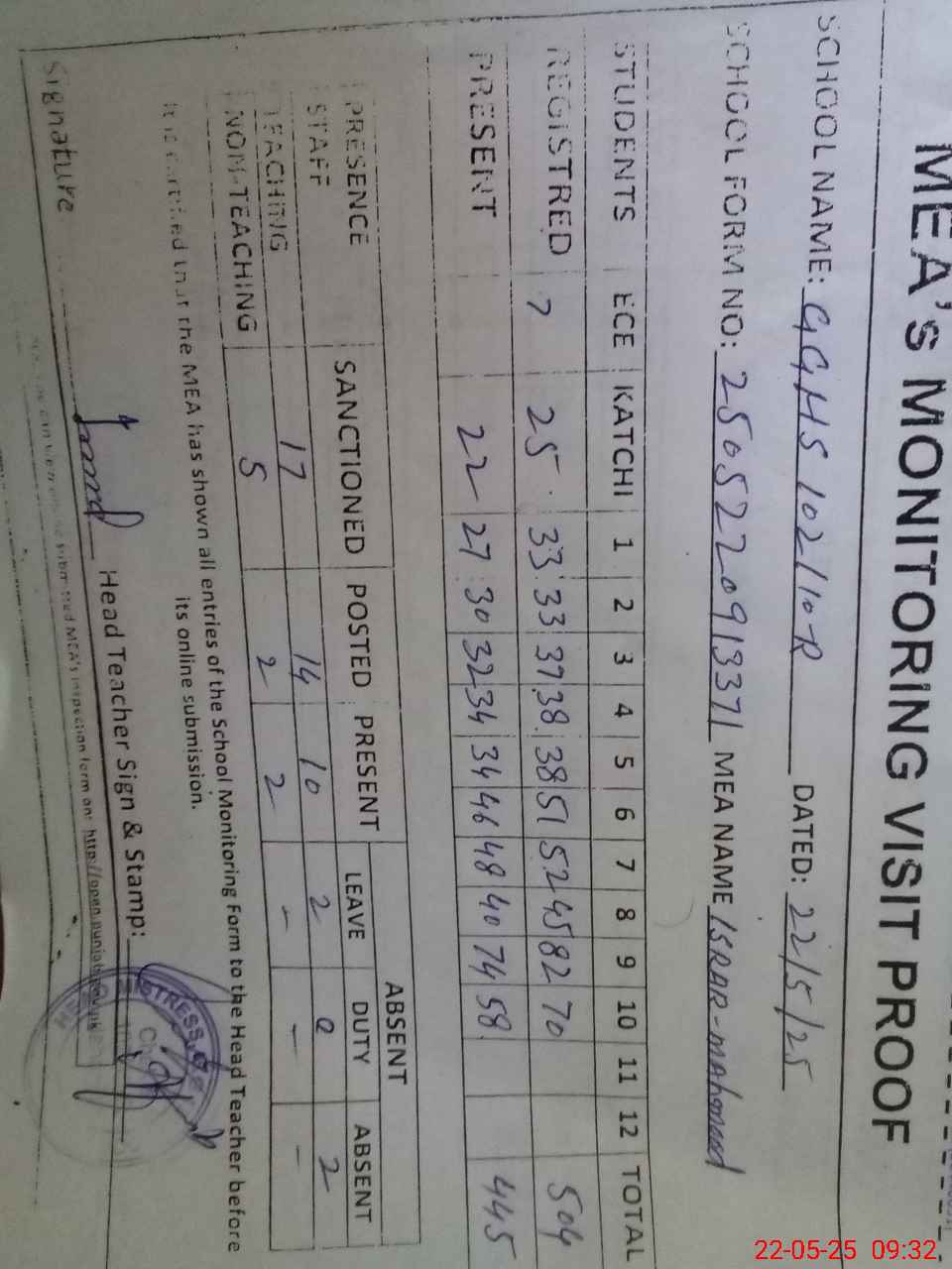 | Attendance Register | Head Teacher | MEA with School | Visit Proof |