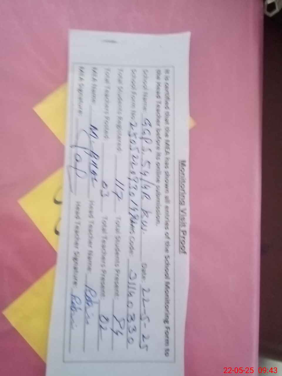 | Attendance Register | Head Teacher | MEA with School | Visit Proof |