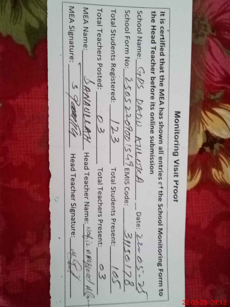 | Attendance Register | Head Teacher | MEA with School | Visit Proof |