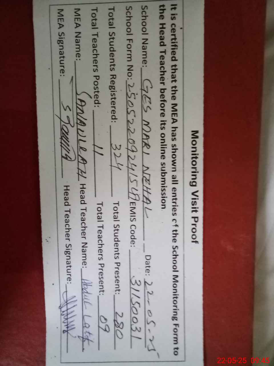 | Attendance Register | Head Teacher | MEA with School | Visit Proof |