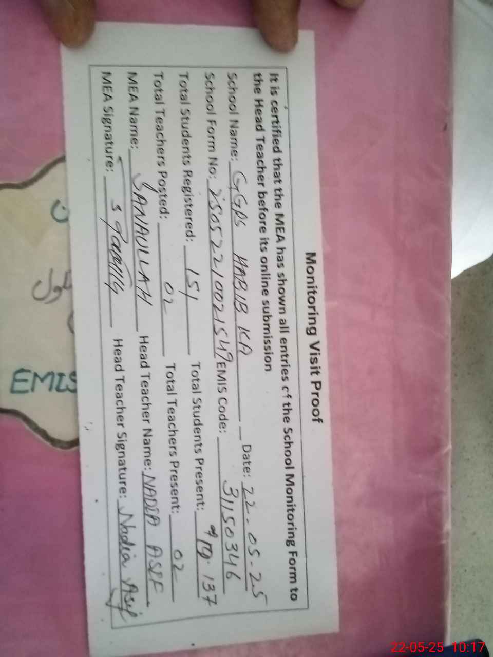 | EMIS Code: 31150346 | Name of School: GGPS HABIB KA | |||