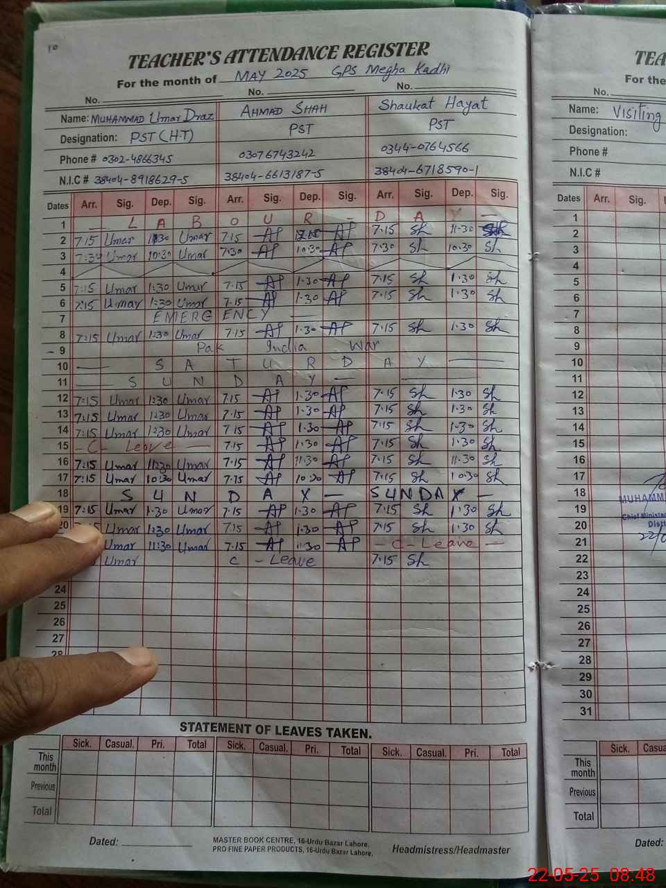 | Name: AR**** MA**** Designation: (School Headmaster's/Headmistress's) PST Phone/Cell Number: 03**** |