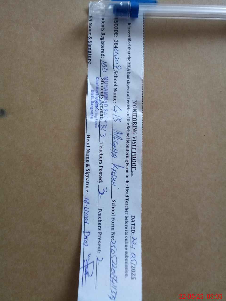 | Attendance Register | Head Teacher | MEA with School | Visit Proof |