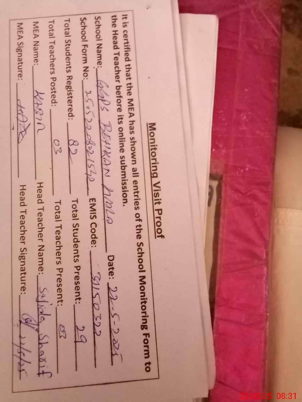 | Attendance Register | Head Teacher | MEA with School | Visit Proof |
