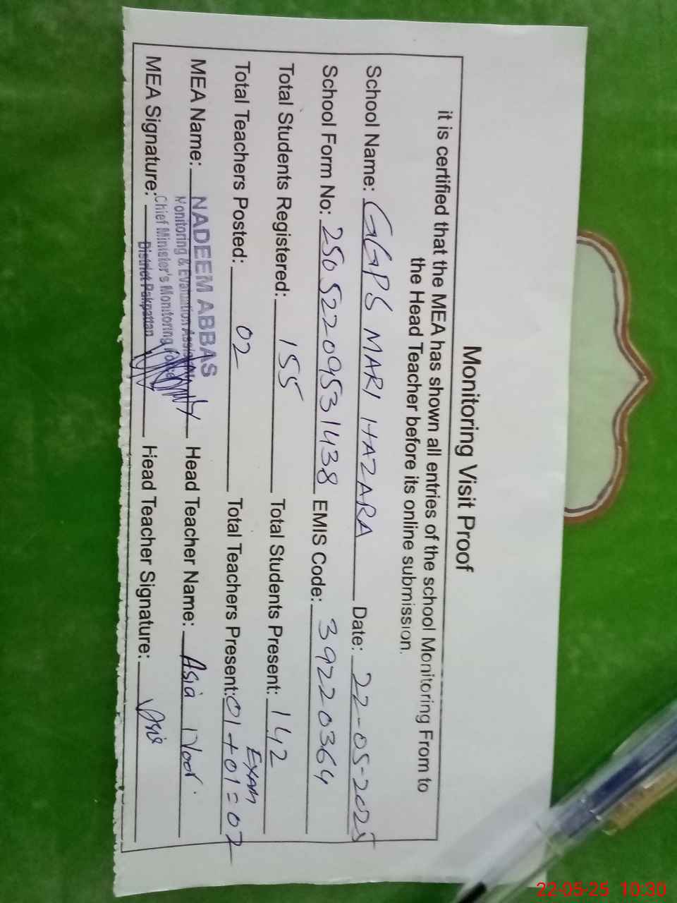 | Attendance Register | Head Teacher | MEA with School | Visit Proof |