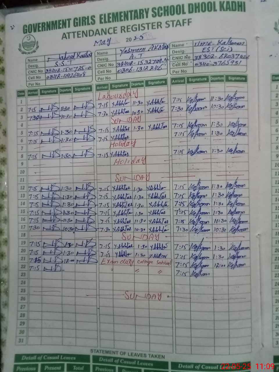| CNIC | Full Name | Designation | R/C | Absence during last cal. month |