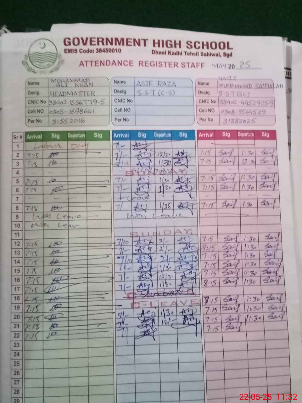 | CNIC | Full Name | Designation | R/C | Absence during last cal. month |