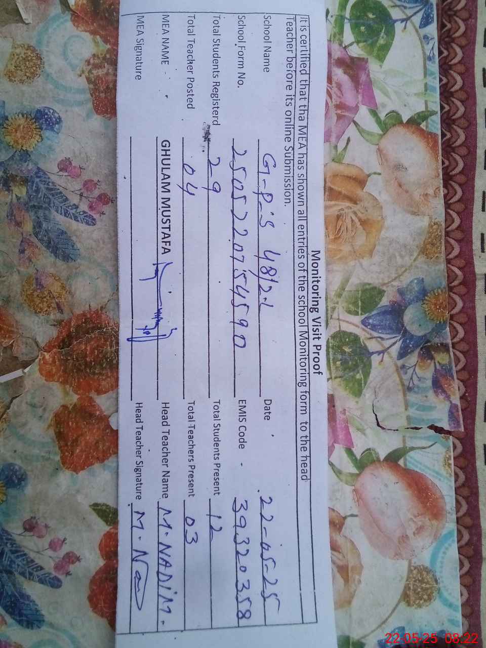 | Attendance Register | Head Teacher | MEA with School | Visit Proof |