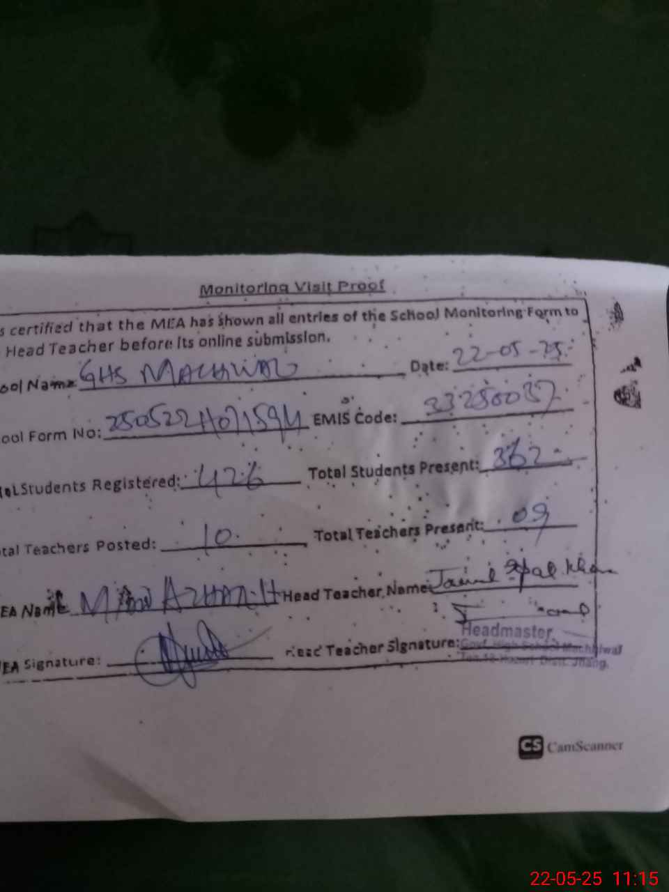 | Attendance Register | Head Teacher | MEA with School | Visit Proof |