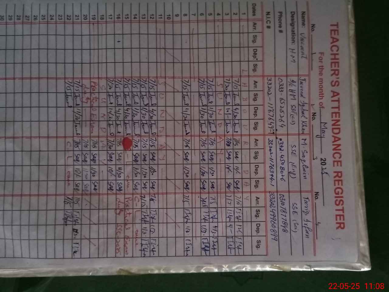 | CNIC | Full Name | Designation | R/C | Absence during last cal. month |