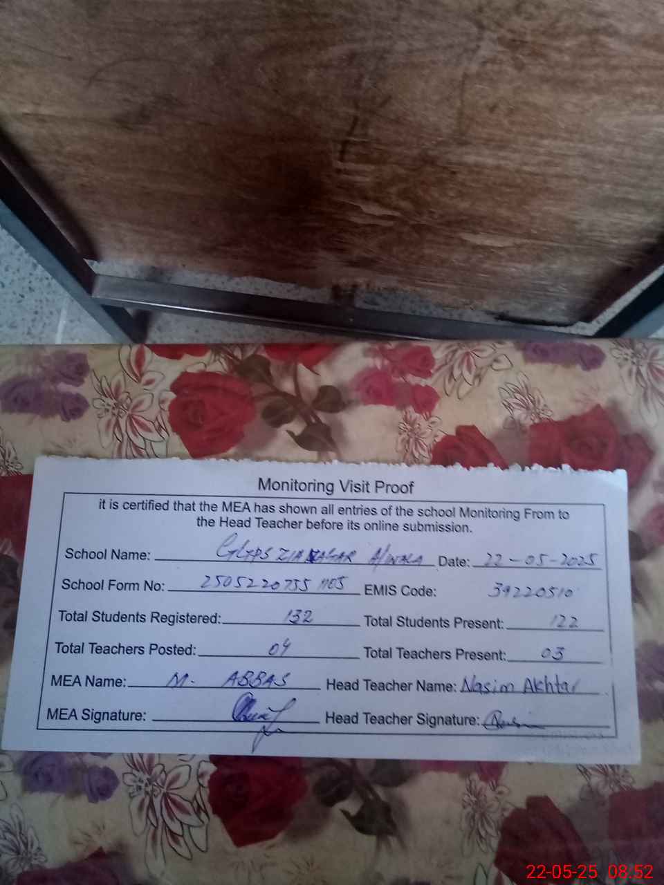 | Attendance Register | Head Teacher | MEA with School | Visit Proof |