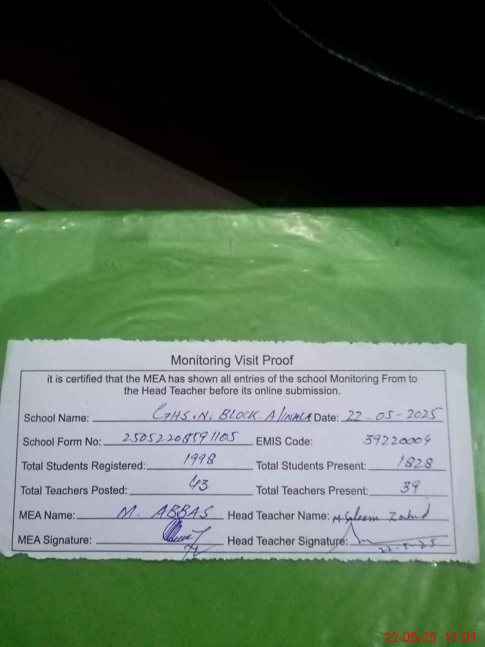 | Attendance Register | Head Teacher | MEA with School | Visit Proof |