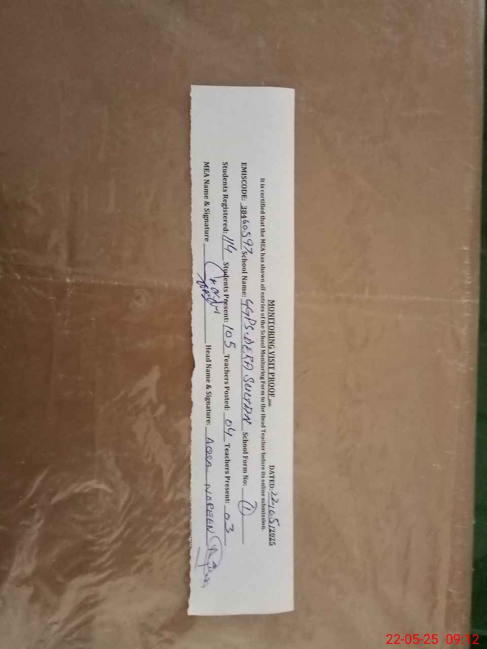| Attendance Register | Head Teacher | MEA with School | Visit Proof |