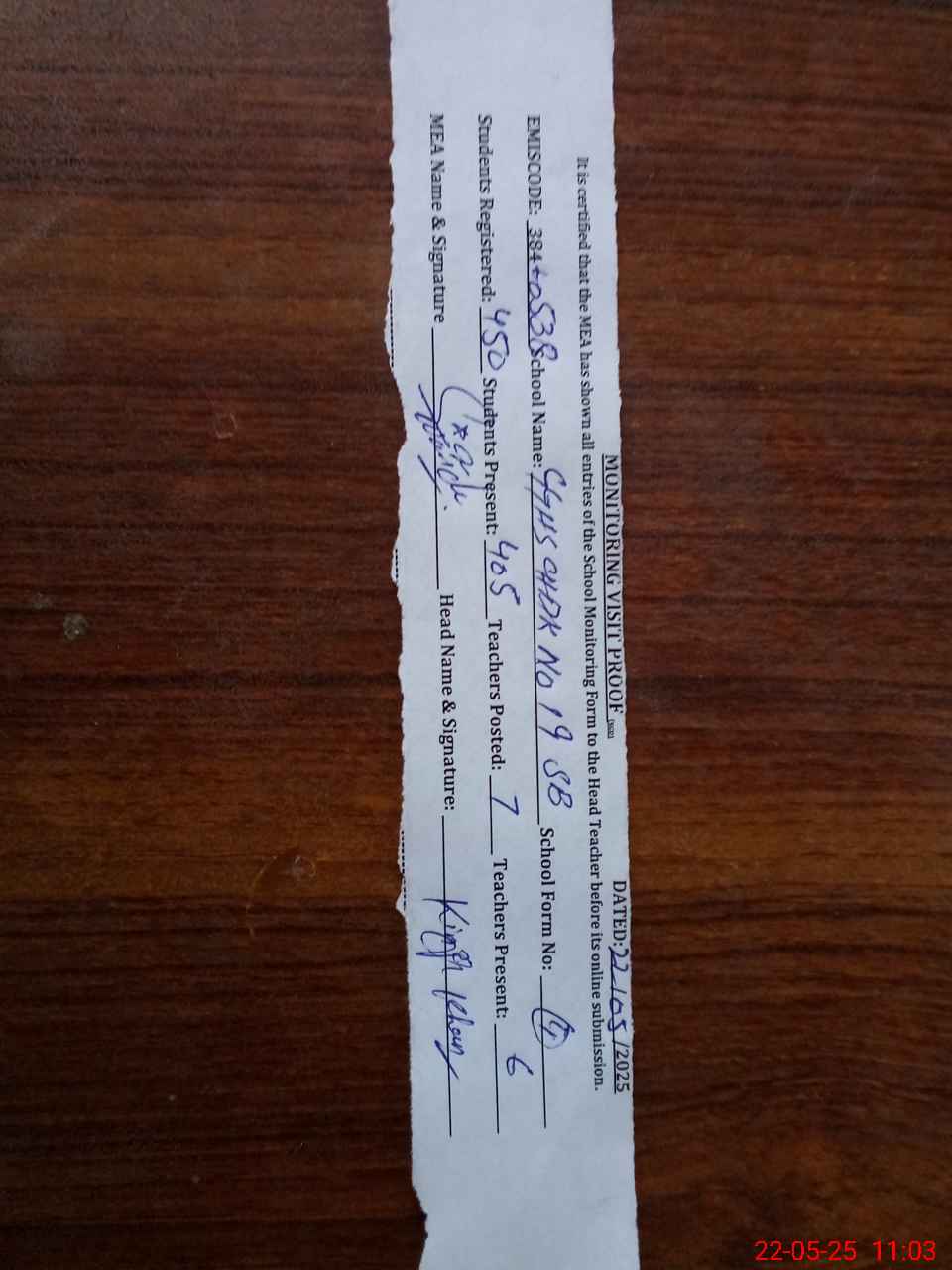 | Attendance Register | Head Teacher | MEA with School | Visit Proof |