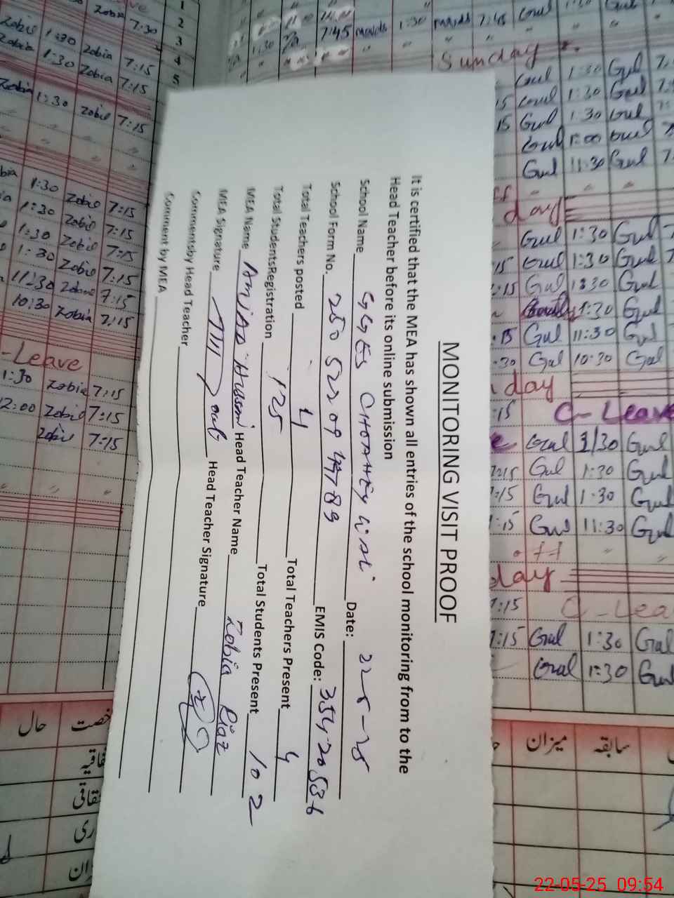 | Attendance Register | Head Teacher | MEA with School | Visit Proof |
