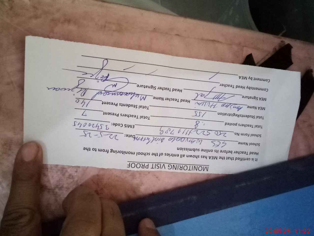 | Attendance Register | Head Teacher | MEA with School | Visit Proof |