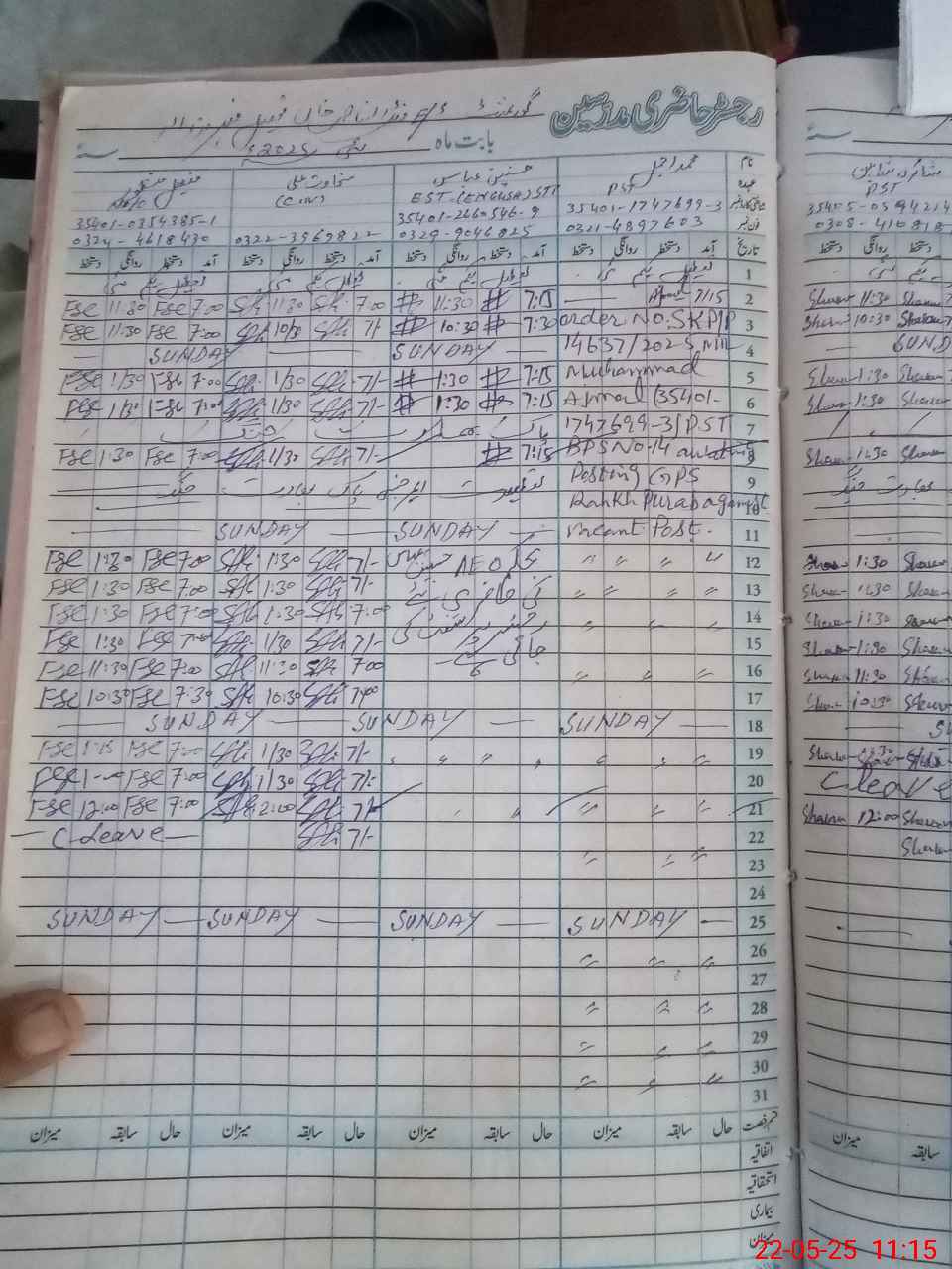 | CNIC | Full Name | Designation | R/C | Absence during last cal. month |