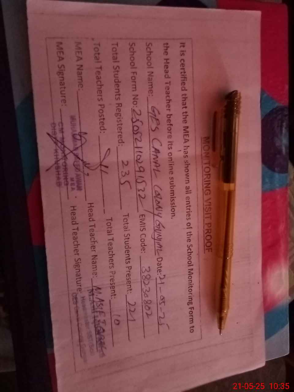 | Certified that this School was Inspected by the Undersigned MEA/DMO Today and the Information Stated Above is as Per Record. | |||||