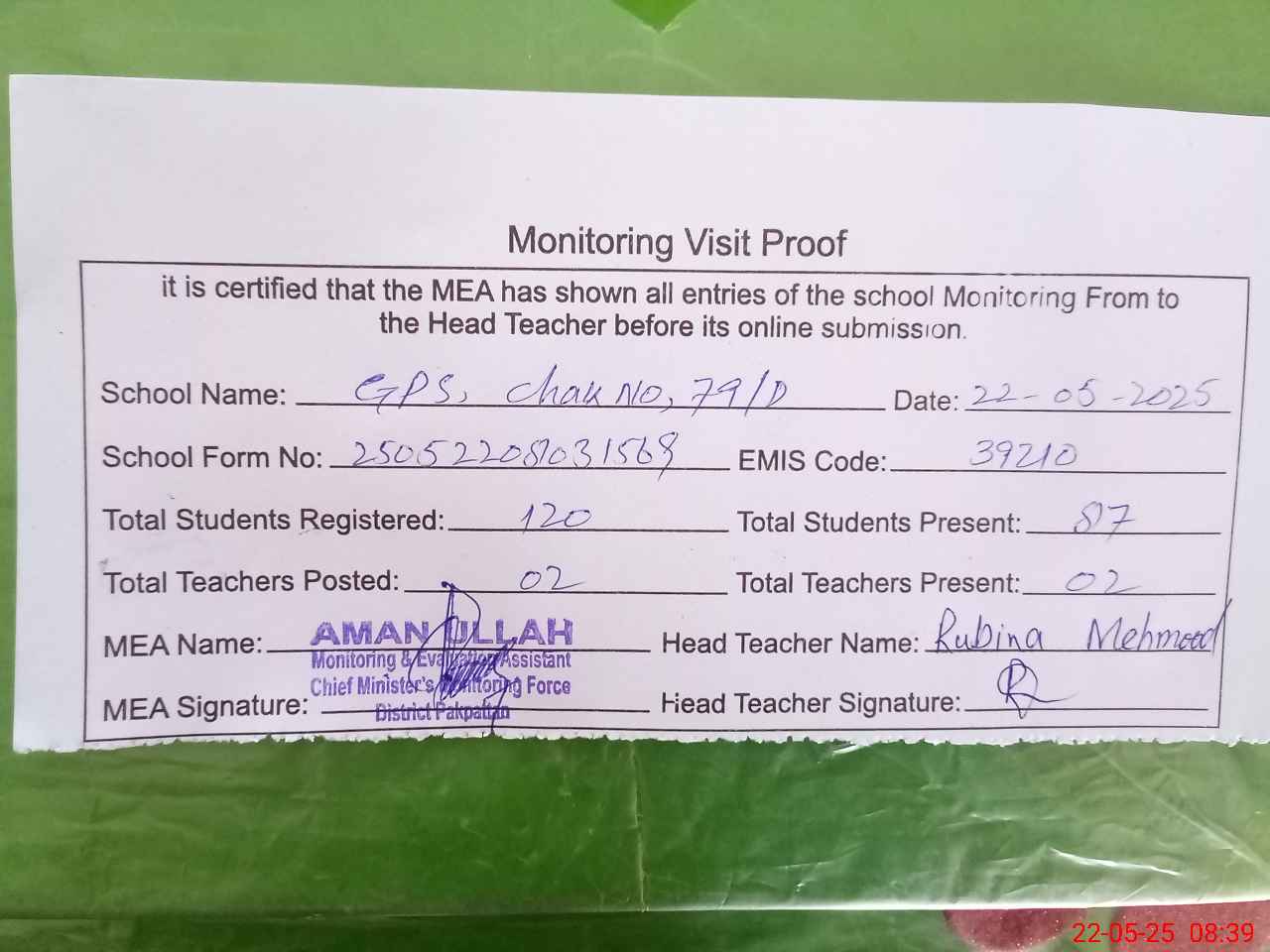| EMIS Code: 39210227 | Name of School: GPS CHAK NO. 79 D | |||