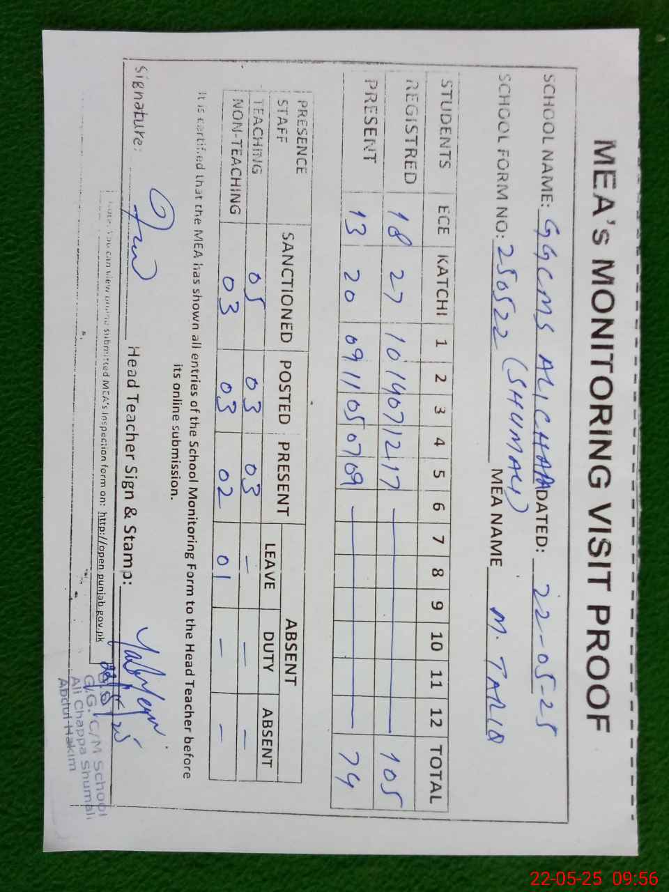 | Attendance Register | Head Teacher | MEA with School | Visit Proof |
