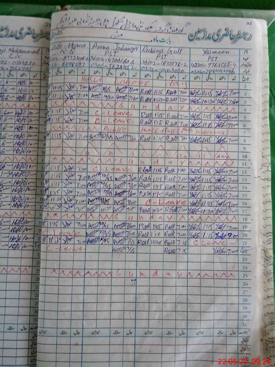 | CNIC | Full Name | Designation | R/C | Absence During Last Calender Month |