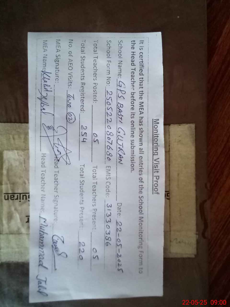 | Attendance Register | Head Teacher | MEA with School | Visit Proof |