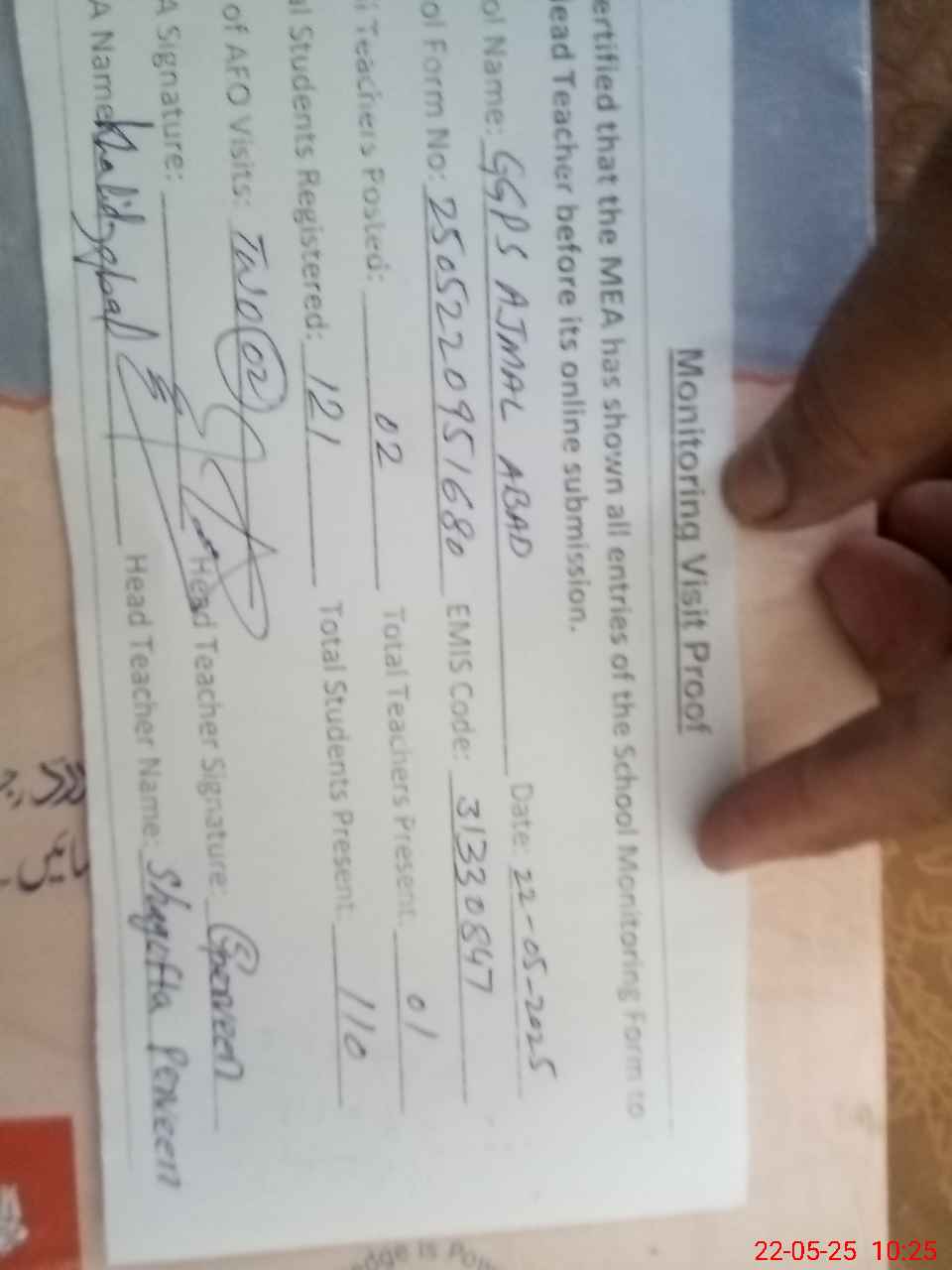 | Attendance Register | Head Teacher | MEA with School | Visit Proof |